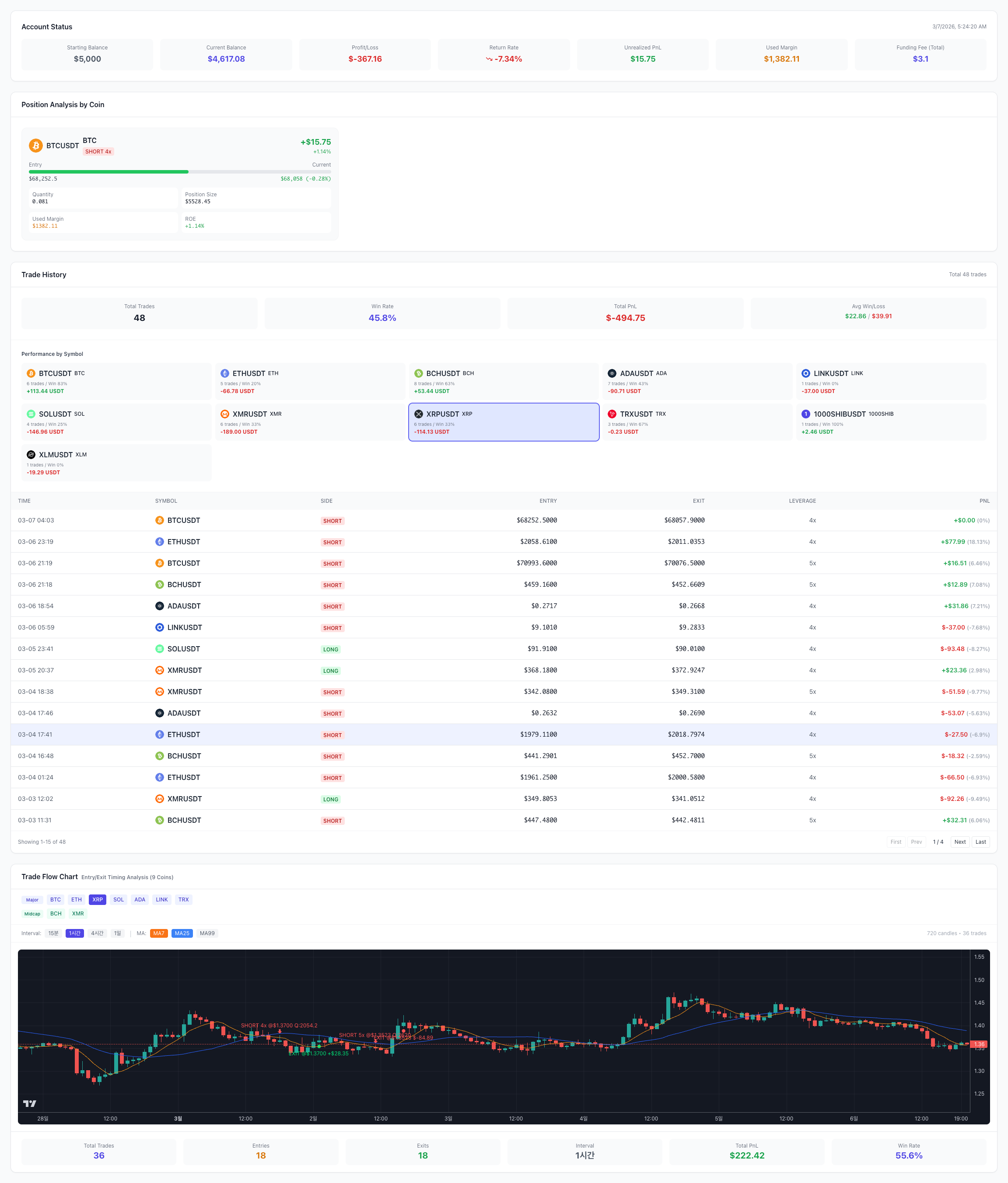 또한 시스템은 암호화폐 거래소 API와 연동되어 실시간 시장 데이터를 수집하고, 알고리즘 기반 분석을 통해 트레이딩 의사결정을 지원합니다.