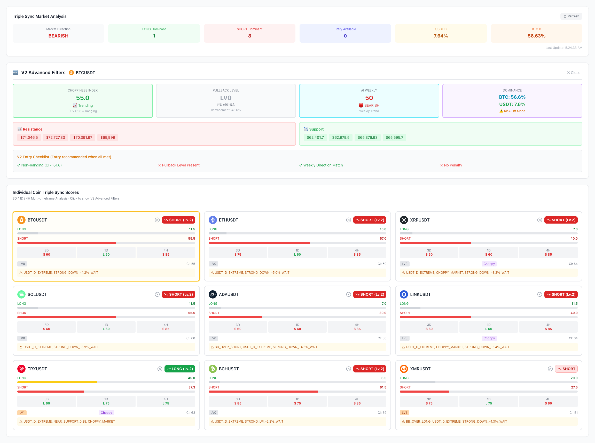 Triple Sync는 여러 분석 신호가 동시에 일치할 때 매매 시그널을 생성하는 구조로 설계되어, 시장 노이즈에 의한 잘못된 매매를 최소화하도록 설계되었습니다.